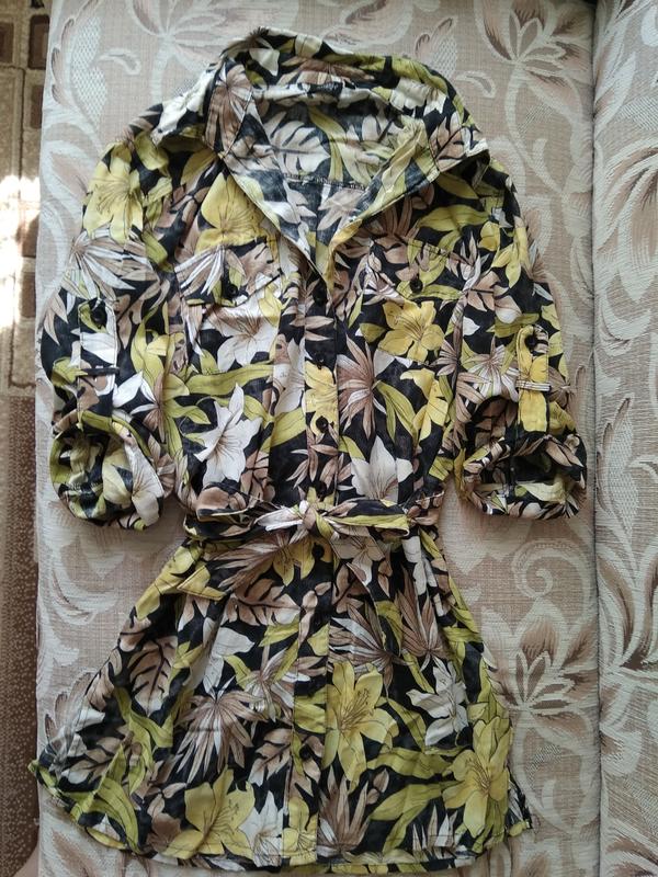 Блуза под пояс с распорками по боках. Длина 77, от/до подмышки 56, рукав 43. Ткань натуральная, лёгкая, не парит.