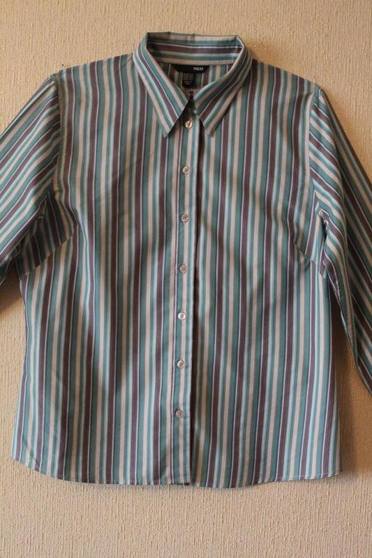 Рубашка H&M. Размер 16/44; плечи - 42 см, пройма - 54 см, рукав - 64 см, ОГ - 112 см, ОТ - 100 см, ОБ - 118 см, ворот - 40 см, длина - 64 см. Состав: 79% хлопок, 21% полиестер. В отличном состоянии!