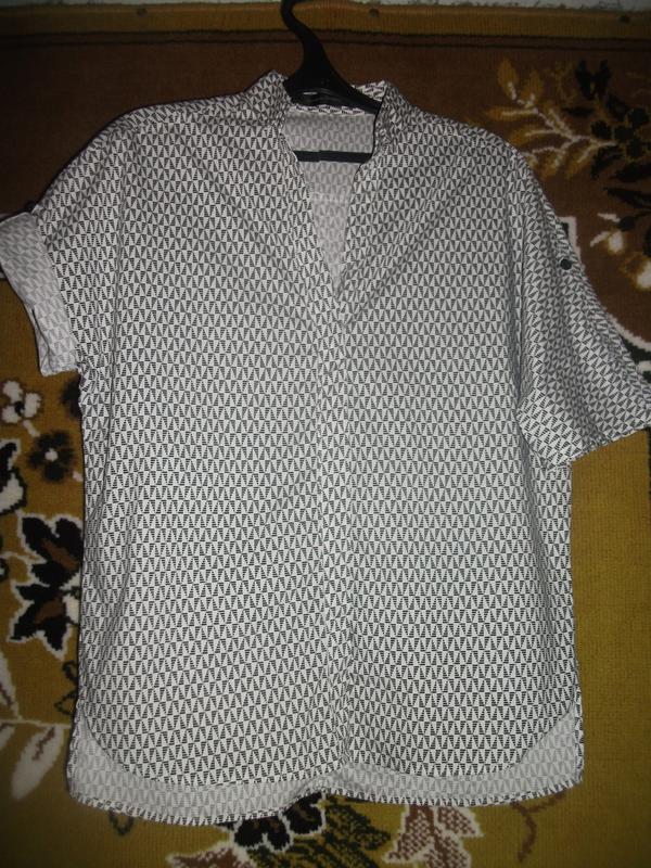 Рубашка Steffen Schraut Размер XS /34 Подходит и под размер L(12/48) Спереди по низу рубашки фигурный вырез,сзади-длинее. В груди-103 см,талия-99 см.Длина по планке спереди-59 см,по середине спины-65 см. Рукав можно носить опущенным или подобранным на пуговицу. Ткань плотная,не прозрачная,стрейч. Состояние идеальное.