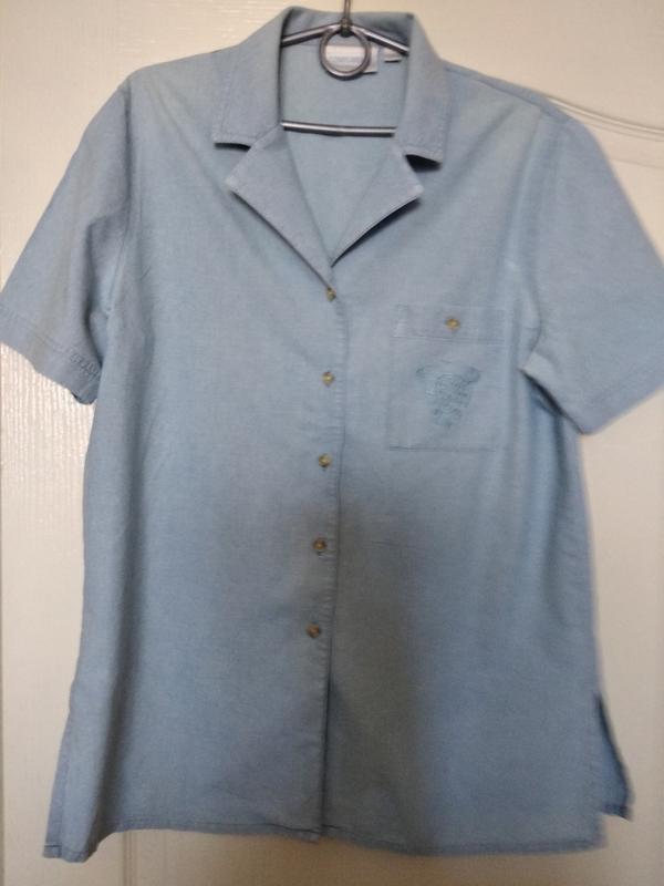 Джинсовая рубашка с разрезами по бокам и с вышивкой на кармане. Замеры: длина - 74 см, рукав - 25 см, плечи - 43 см, по груди - 52 см, по низу - 56 см.