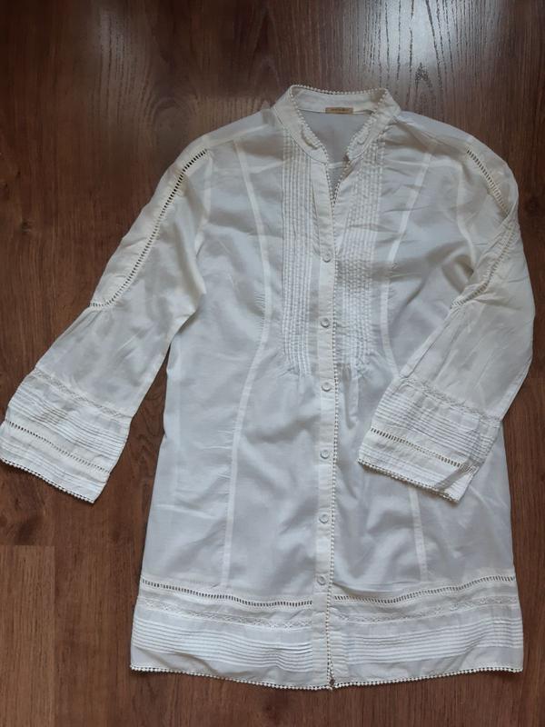 Натуральная ткань, НЕ тянется. Тонкая, легкая, идеальна для лета. Размер S-M Под руками немного видны следы носки (не идеально белая). Длина рукава от воротника 64. Ширина под рукавами 49, бедра 50, длина рубашки 79.