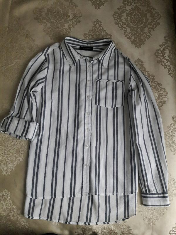 Лёгкая стильная рубашка свободного кроя. Внутри бирки срезаны. Состав 100%котон. Рукав подварачивается на пуговку. По бокам глубокие разрезы. Дефектов нет! Замеры: Длина: перёд- 61см.,зад-70см. Рукав- 59см.Плечи-40см.ПОГ-53см.ширина-55см.
