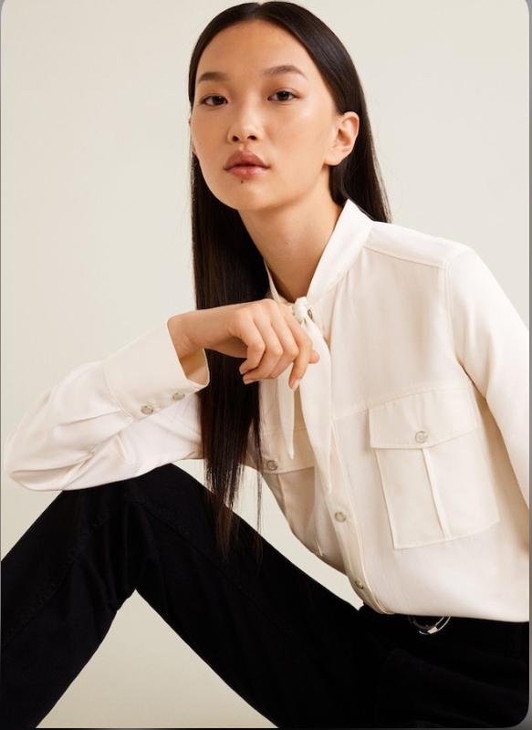 Рубашка с нагрудными карманами Mango. Мягкая ткань, классический воротник с завязкой на шее. Длинный рукав с манжетами. Двойные карманы на клапанах спереди. Застежка - кнопки. Состав: 100% лиоцелл. Цвет - экрю. Размер: US6/M/46 ПОГ 52 см Длина рукава от горловины 71 см Длина изделия по спинке 66 см. Низ немного скругленный.