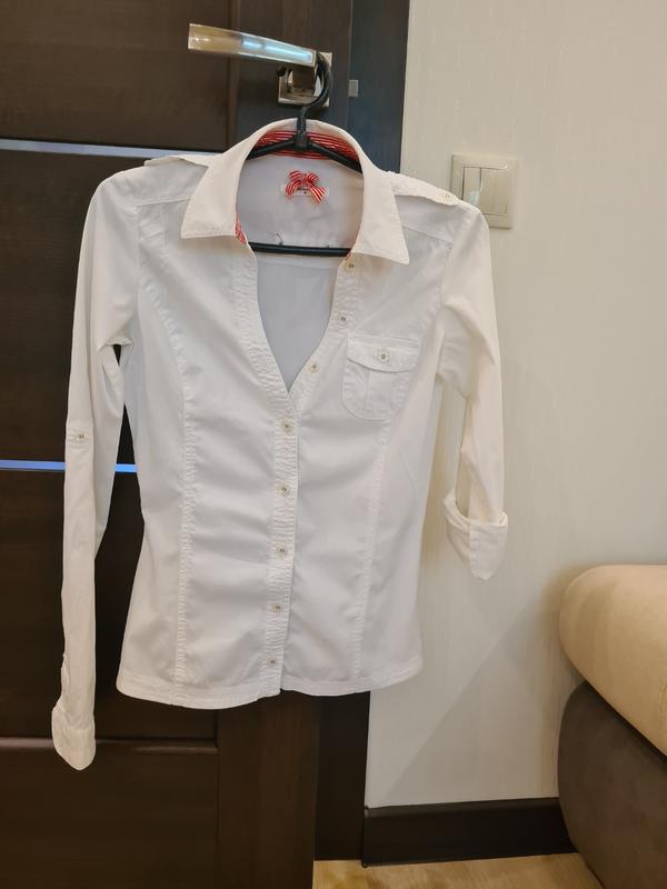Рубашка с длинным рукавом фирмы OLIVEdesOLIVE, цвет белый, размер указан EUR - S. Рубашка в идеальном состоянии. Длина рукава регулируется, показала на фото. Ткань тянется, бирка с сотавом срезана. Замеры: полуобъём груди - 43 см, длина изделия - 55 см, плечи - 35 см, длина рукава от плечевого шва - 61 см, длина рукава по внутреннему шву - 51 см.