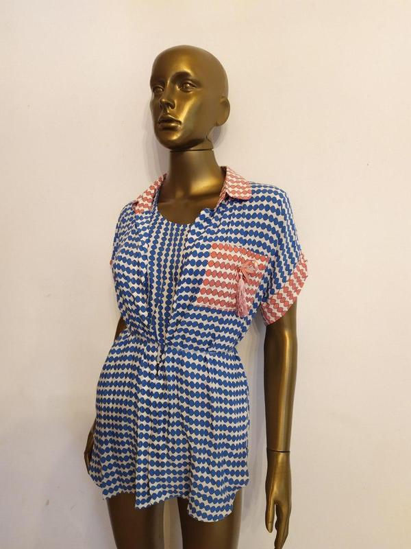 Специально для нашего магазина известный украинский дизайнер Кристина Гусина создала свою летнюю коллекцию одежды. Ткань легкая, мягкая, приятная к телу. Рубашка пригодится не только на отдыхе у моря, но и станет отличным украшением образа на вечеринке у бассейна или ужине в прибрежном ресторане. Спереди глубокий карман, воротник стойка. Рубашка без пуговиц. Размер S-M. Длина изделия: 72 см, ПОГ 47 см