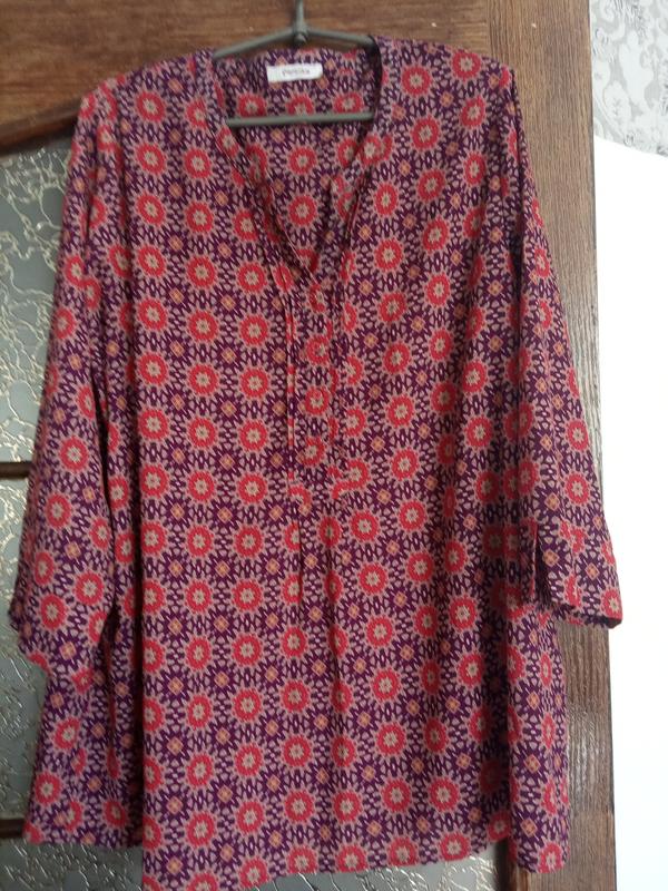 В хорошем состоянии, симпатичная рубашка. Цвета яркие, насыщенные. Хоршая длина, широкий рукавчик. Есть маленький дефектик, ввиде пару малюсеньких зацепок, которые не видно( 5 фото). Замеры: длина 76, плечи 43, длина рукава 52, обхват проймы 62 см, обхват бицепса 48 см, грудь 132, пояс 134, низ 146 см.