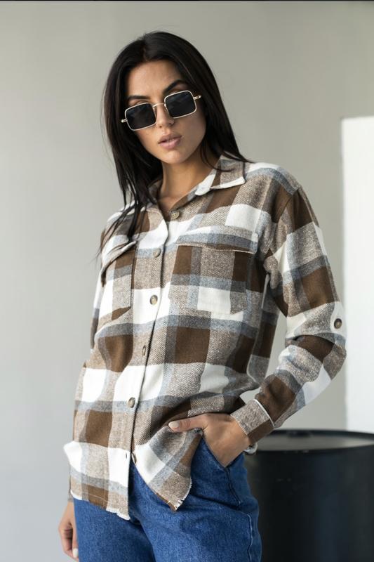 Красивая рубашка с модным клеточным рисунком представлена из натуральной вискозной достаточно плотной ткани. Рубашка имеет классический воротник, застегивается на пуговицы с дизайном под дерево, такие же пуговицы украшают манжеты. Накладные карманы полностью функциональны. Края низа изделия необработанны, что придает дерзости образу. Рубашка идеально походит для холодных осенних и даже зимних дней, так как она весьма теплая и под нее модно поддеть футболку или другой вид одежды. С такой рубашкой легко создавать классические, повседневные и даже строгие образы.