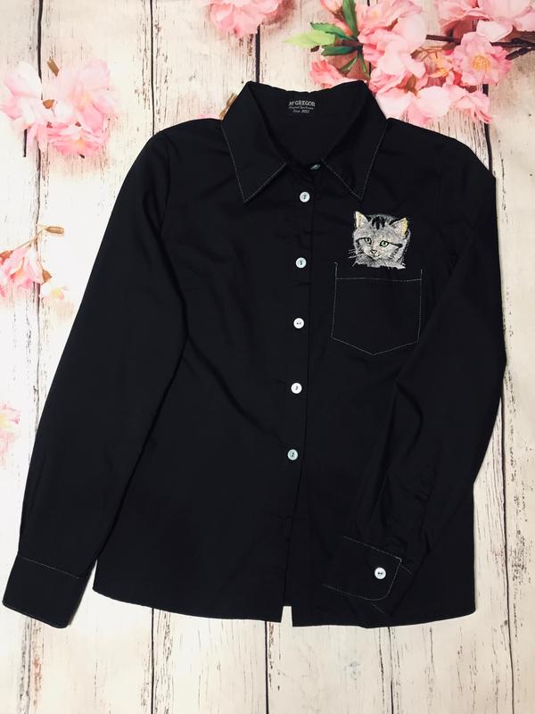 Очень классная чёрная рубашка с вышивкой котика! Состояние идеальное, вот только нет последней пуговички, можно легко подобрать. Рубашка прошита голубенькими нитками, котик серенький. Замеры: пог 46 см., плечи 38 см., длина 63 см. Есть много интересного смотрите и другие мои объявления! Подписывайтесь чтобы быть в курсе новинок!