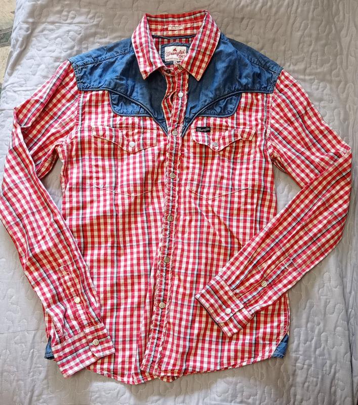 Стильная рубашка Wrangler, оригинал, замеры: ПОГ-49 см, длина-70 см, длина рукава-63 см. Состояние идеальное, состав хлопок 100%.