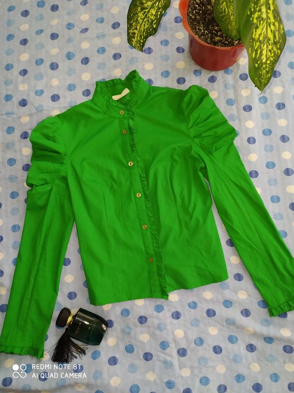 Плотная качественная ткань, травяной зелёный цвет, очень интересно отделена рюшей и рукава фанарики, стойка воротник 💚💚💚 Мне стала маловата (((
