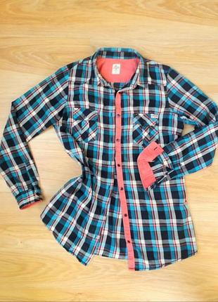 Коттоновая рубашка в клетку ,бренда House Легкая удобная, на груди кармашки, ззади удлененная .Можно носить одну, можно поверх футболки, майки) стильно выглядит. Плечі 38 см, рукав з манжетом 60 см, пог 49,5 см, пот 48 см, поб 52 см, низ пошито півколом, максимальна довжина 74 см
