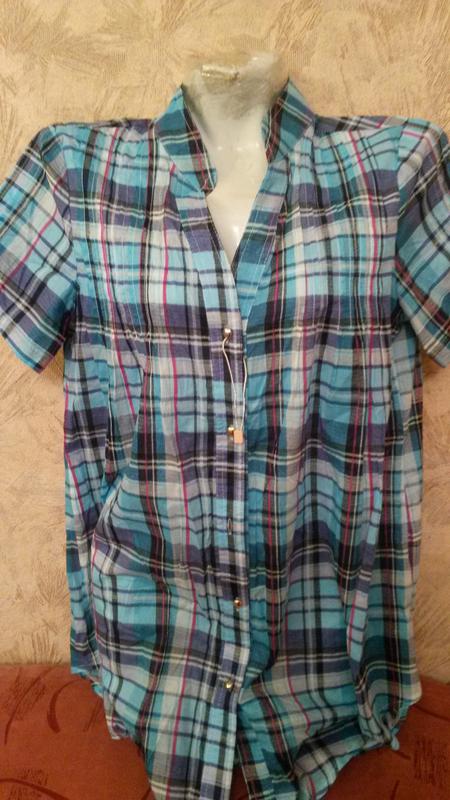 Рубашка на лето. Тонкая приятная ткань, на лето отлично Рубашка в клетку в синих тонах. Клетка: сине-черная-голубая-бирюзовая К низу расклешенная Размер XL (смотрите замеры) Состав не указан, но очень похоже на поплин Реальные замеры: Длина - 78см Ог от шва до шва - 48см Ширина внизу - 66см Плечи - 37см Рукав - 21см