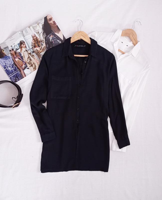 подовжена сорочка темно синього кольору фірми Even &Odd вільного крою, тканина віскоза, розмір вказано S, ПО грудей 50 см, довжина 80 см, рукав 60 см
