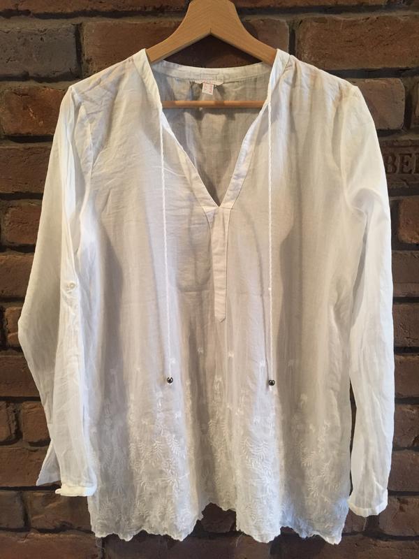 Летняя хлопковая туника Esprit. Очень тонкая и лёгкая. Рукава можно завернуть и застегнуть на пуговицу. Украшена белой вышивкой. Внутренняя бирка с составом обрезана, так как была видна из полупрозрачной ткани.