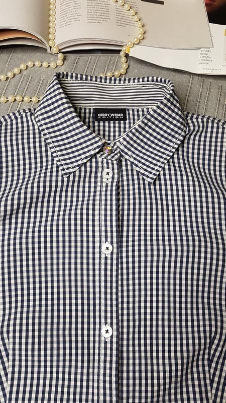 Женская рубашка от Gerry Weber. Стильный и актуальный принт. Верхняя пуговичка декоративная, остальные все брендированы. Манжет может быть стандартным или узким. Ткань немного тянется и практически не мнется. Вытачки спереди и сзади. Размер 38. В составе 79% коттона. Состояние прекрасное. Замеры: Длина - 62 см Длина рукава - 60 см ПОГ - 51,5 см ПОТ - 46 см ПОБ - 51,5 см