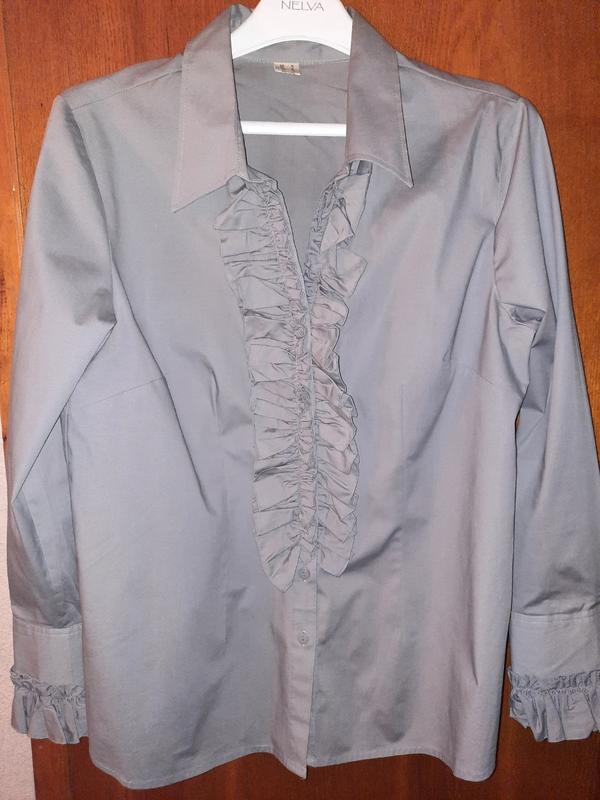 Строгая, элегантная, нарядная рубашка, цвет серый,как на 1 фото, интересная отделка-жабо на полочке и на манжете. Длинна- 70, рукав с манжетом- 64, ПОГ- 56. Хлопок.