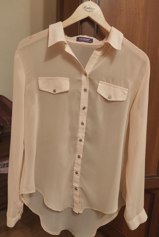 Нежная, приятная к телу . Цвет пудра . Просвечивает, размер указан 42. Зад удлиненный 75см, перед 62см, рукав 61см, плечи 41.