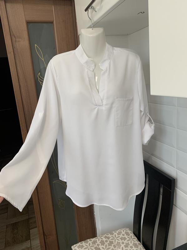 Сорочка біла, тканина шефон,сорочка на стійочку,рукав по бажанню закочується.Низ сорочки завкруглений.Розмір пише ХL але можна носити з розміру М,L,XL