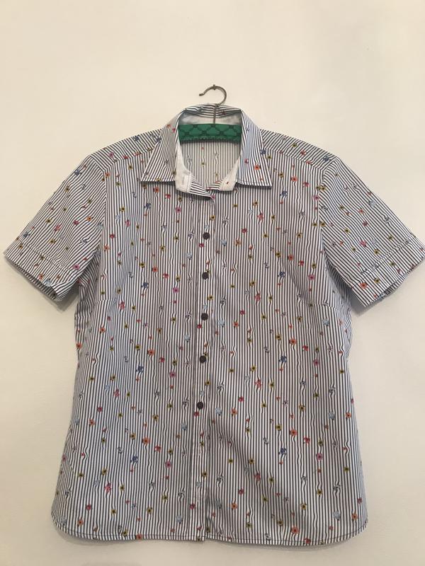 Дорогая, стильная рубашка известного бренда. Состояние идеальное, без дефектов. Размер указан 40 Подойдёт на 38-40 Длинна 52 Плечи 42 Рукав 22 Пог 52-54 Пот 50 По низу до 56