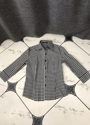 Стильна сорочка в клітку з четвертним рукавом, стан нового, щільна тканина тримає форму. Підійде на XS-невелику S. Виміри вироби: напівобхват грудей 36 см, довжина рукава 43 див. стрейчева Тканина. Модель приталені сорочки.