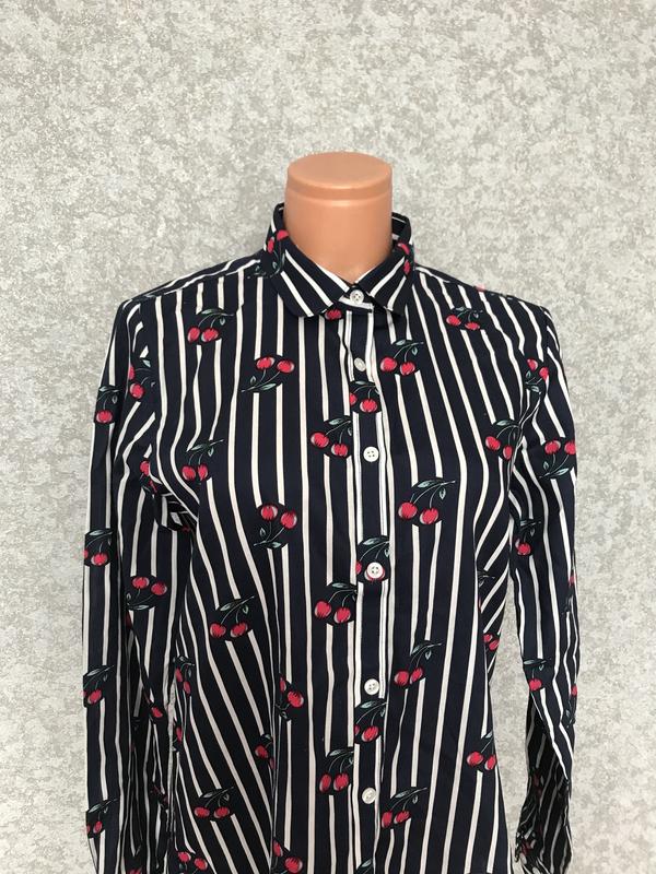 Стильная полосатая рубашка , в вишеньки , стильно выглядит на теле. Приятный материал. Подойдёт на размер С-М. Новая - без бирки. Параметры Длина - 68 см ПОГ - 51 см Плечи - 38 см Рукав: внешний шов- 63 см, внутренний шов- 50,5 см
