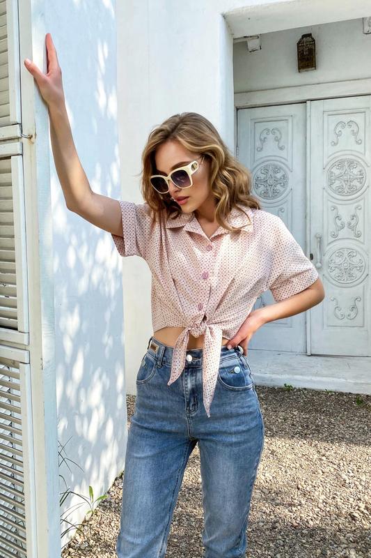 Короткая рубашка оверсайз на пуговицах с завязками розовый 3 цвета