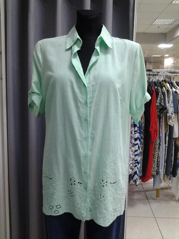 Лёгкая удлинённая рубашка из ткани с вышивкой в цвет купоном. Цвет рубашки яркий салатовый (на фото гораздо бледнее). По спинке лёгкое приталивание за счёт вытачек. Рубашка хорошо сочетается с брюками, капри и юбкой.