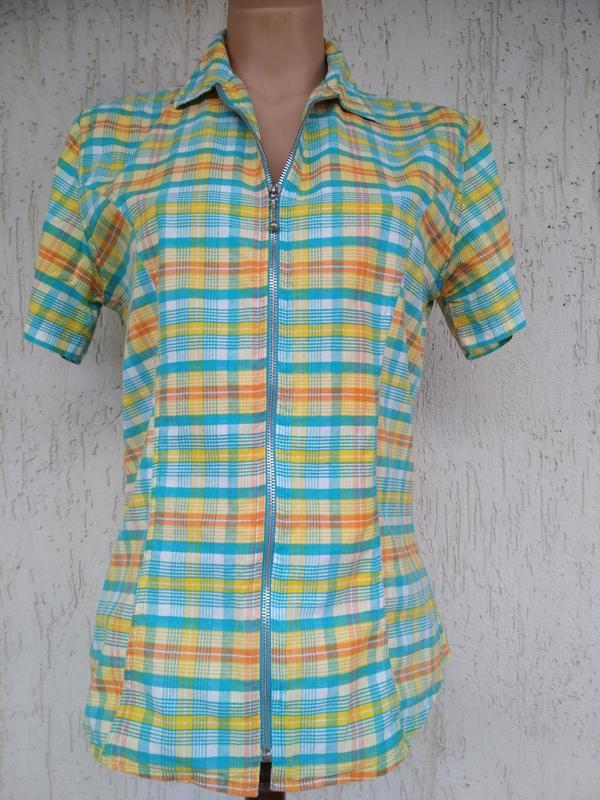 Отличная коттоновая рубашка на молнии. Длина 69, полуобхват 50. Лёгкая, комфортная, приятное сочетание цветов.