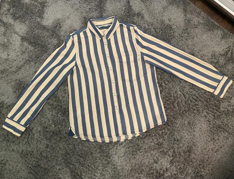Рубашка Mango прямого кроя в сине-бежевую полоску. Хорошо сядет на размер S/XS
