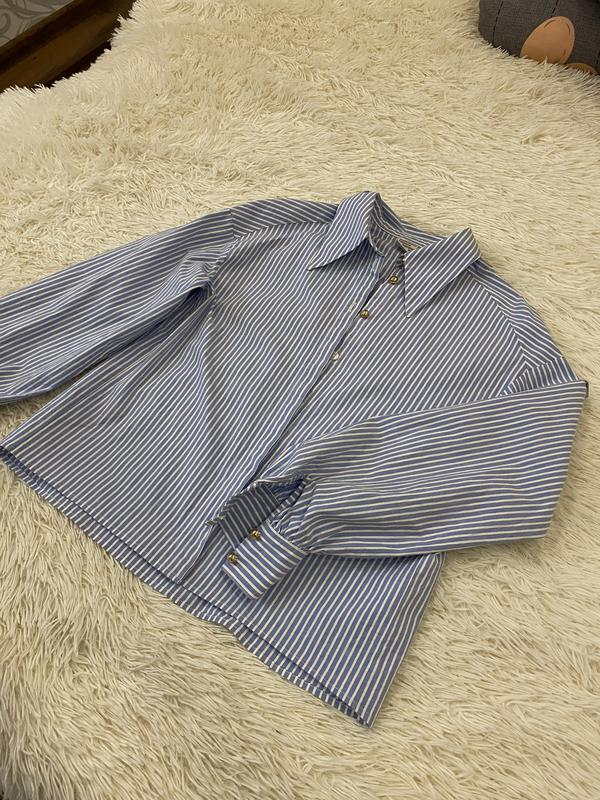 Гарна сорочка, біла у ніжно-блакитну смужку. Незвичайний рукав(об'ємний ) Верху 3 золоті ґудзики видно, решта приховані йдуть біленькі Розмір с-м