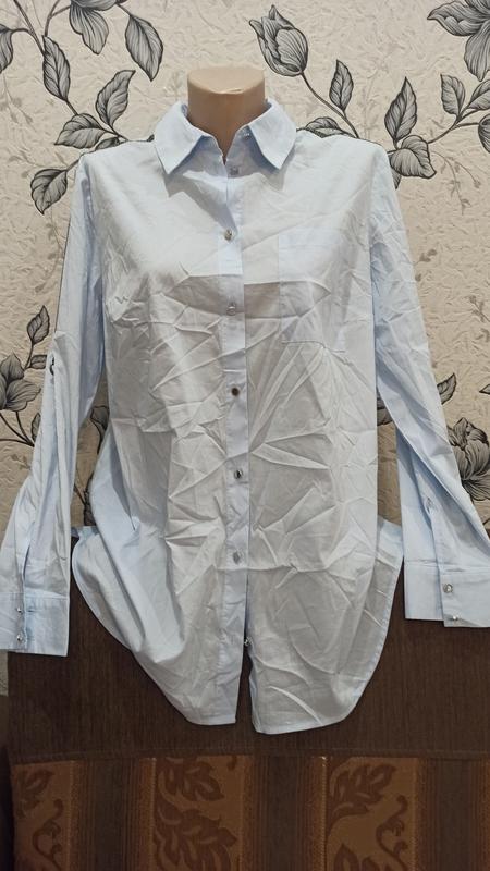 Очень милая рубашка с хорошим составом нежно голубого цвета. Следы носки минимальные, как новая. Сток .Оригинальности придает налитая тесьма в леопардовый принт по плечами вниз по рукаву Плечи 42 Пог 57 Рукав 60.5, можно фиксатором носить как 3 четверти Длина 74.5см