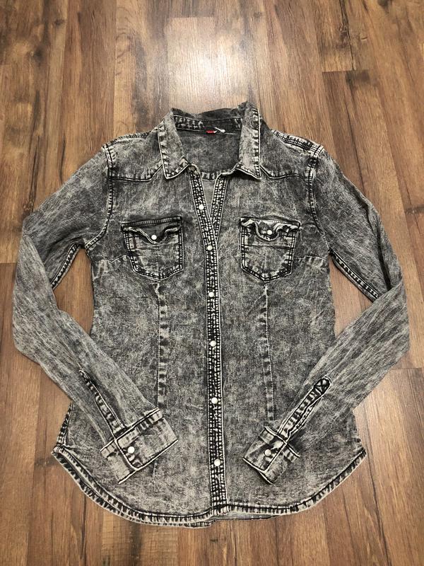 Джинсовая рубашка очень хорошо тянется застёгивается на заклёпки низ полукругом