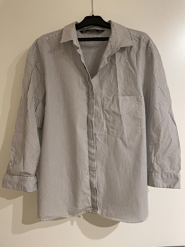 Оверсайз рубашка в полосочку с накладным карманом и рукавами 3/4, размер М
