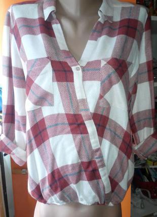 Интересная клетчатая рубашка с эффектом запаха (но все пристрочено),свободного кроя ,внизу тонкая резиночка,рукав корректируется по длине.,на боку нашивка-овечка.Очень приятная к телу Размер 10-идет на разм. С и на М будут отлично за счет кроя