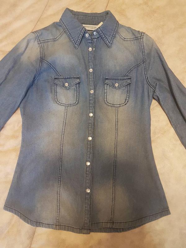 Джинсовая рубашка. Застегивается на кнопки. Есть шлейка чтобы носить рукав подвернутым - видно на последнем фото. Указан размер XS, но лучше подойдет на S - M. Длина 60 см, пог 44 см, пот 39 см, длина рукава 61 см.