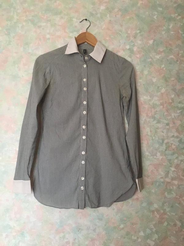 Сорочка в дрібну смужку. Заміри: ПОГ - 40 см, довжина - 69 см, рукав - 59 см. Склад: 71% бавовна, 21% поліамід.