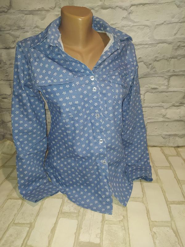 Рубашка в мелкий цветочек,плотная,с кармашками,на рукавах в районе локтя пуговицы пришиты,манжеты можно там фиксировать,состояние идеал,размер указан xs, длина рубашки 62 см,рукав 55.5 см,по плечам 37 см,от подмышки до подмышки 41 см