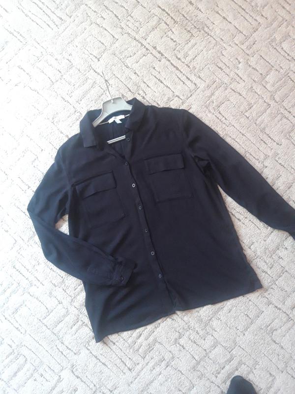 стильна чорна сорочка з карманами,гарно виглядає,бірки про склад тканини немає,але скоріш за все віскоза,не синтетика,плечі 40,ширина 51,довжина 65,рукава 61