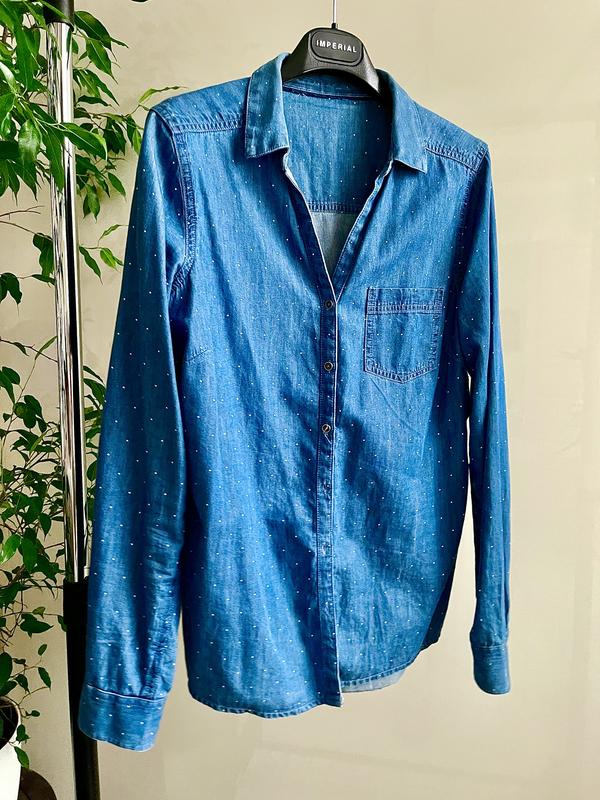 Джинсова сорочка - справжня класика!🦋 Виготовлена з органічного котону і забезпечує оптимальне зручність. Класичний синій денім поєднується з білими крапками. Є нагрудний кишеню, металеві гудзики з декоративним тисненням і невеликі бічні розрізи, роблять образ цієї джинсової сорочки ідеальним. 100% бавовна. Розмір S-M