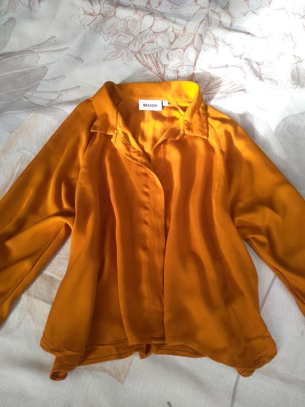 Рубашка в горчичном цвете, в отличном состоянии. Сама по себе широкая и укороченная. Размер 44-46