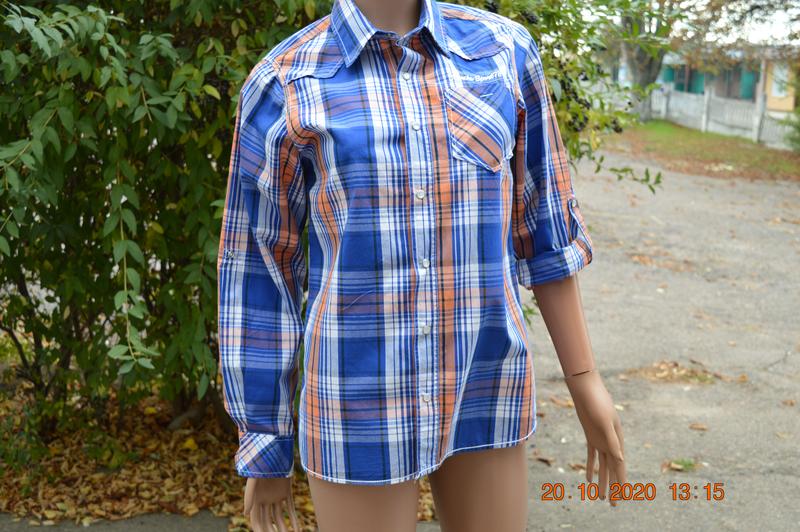 Яркая хлопчатобумажная рубаха, всё - как на фото. Замеры: полуокружность груди - 47 см, длина спины - 65 см, длина рукава - 58 см. Рукав в стиле милитари. На кнопках.