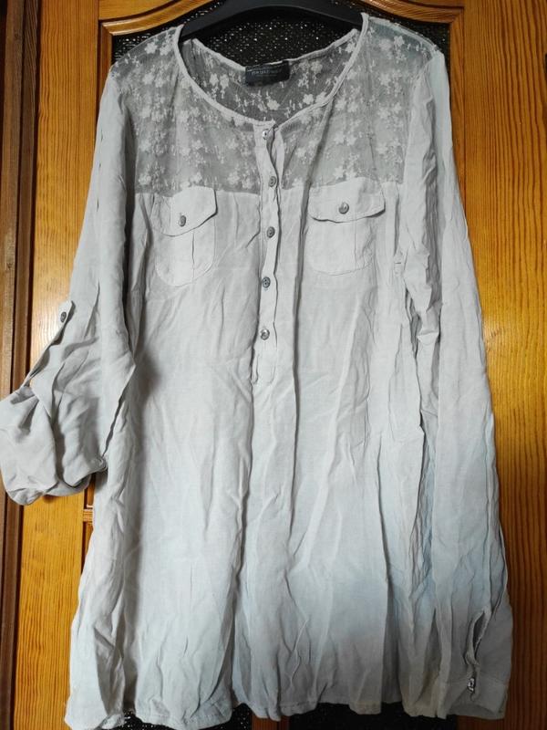 Блуза, рубашка оздоблена гіпюром, світло-сірого кольору. Дуже ніжна на дотик, як сатін. Розмір L, наш 46-48. Довжина 75, рукав 67, плечі 40 - 45, ПОГ до 52, низ до 60 см. Стан чудовий, без дефектів.