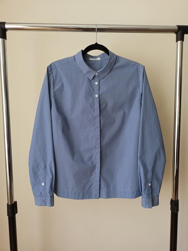 Синього кольору у тонку білу смужку, прямого крою сорочка преміального німецького бренду. Стан ідеальний нової речі.Розмір M - L Заміри: ширина по грудях - 54 см, ширина по низу - 55 см, довжина виробу по спинці - 64 см. Склад: 65 % бавовна, 29 % нейлон, 2 % еластан. Рекомендований догляд: прання і прасування при низькій температурі.