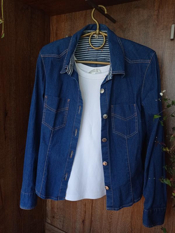 Трендова джинсова сорочка. Чудової якості, гарного насиченого синього кольору. Дуже гарно виглядає в поєднанні з топом або футболкою. ПОГ - 46 см ПОТ - 41 см Низ - 45 см Довжина - 58 см Рукав - 52/58 см(загинається) Ширина плечей - 39 см