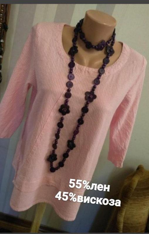 Очень красивая льняная блуза свободного интересного кроя , приглушенного пастельного розового цвета. Бкдет хорошо смотреться под светлые брюки или шорты в отпуске или под юбку карандаш на работу😄 Состояние как новое длина 63 плечи 37 рук 43 пог 50-52 пот 60 состав лен, вискоза♥️
