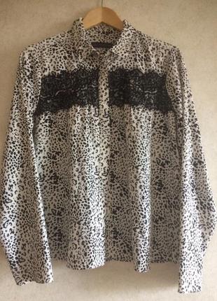 Стильна , якісна блуза. Завжди модний колір та принт. Тканина не просвічує, кружево теж, пугвиці не видно. Розмір 14/42 можна пробувати на інші. Довжина 63 см, ПОГ 57 см , лінія низу 64 см