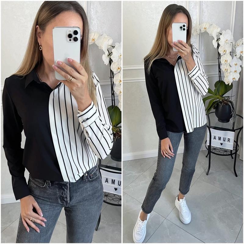 Сорочка арт. am. 312/1312 Ціна : 650 грн Розміри: 42-44, 44-46, 48-50, 52-54 Тканина: супер софт Корея Трендова сорочка колорблок, поєднання однотона і смужки зробить ваш образ цікавим і унікальним. Сорочка застібається на гудзики, приховані під планочкою, манжети на гудзиках, класичний сорочковий комір. Кольори: білий з ніжно-рожевою смужкою, білий з ніжно-блакитною смужкою, чорний з молочно-чорною смужкою. Спинка скрізь однотонна.