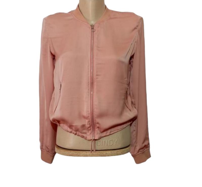 Бомбер застёгивается на молнию. Ткань тонкая, приятная на ощупь. Манжеты, низ, горловина - трикотажный. Размер указан EUR S. 🌼 плечи 34 🌼 ПОГ 48 🌼 ПОТ 48 🌼 ПОБ 48 🌼 длина рукава 59 🌼 длина 51 Состояние нового, но имеется небольшой нюанс по спине, см. последнее фото. В цене учтено.