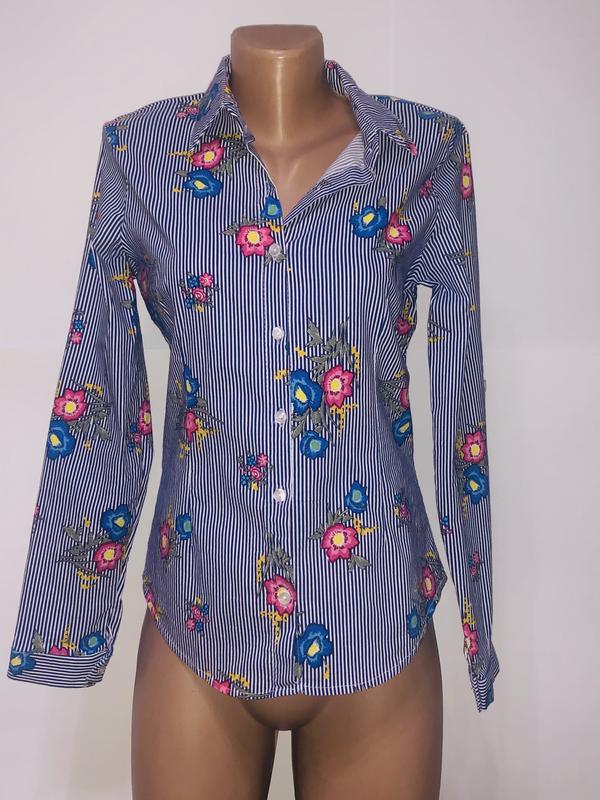 Приталенный рубашка в цветочный принт, состав: 40% коттон, 60% полиэстр, хорошо тянется. Замеры: пог 46, пот 40, по низу 44, длина 60, рукав 58. Производство Турция