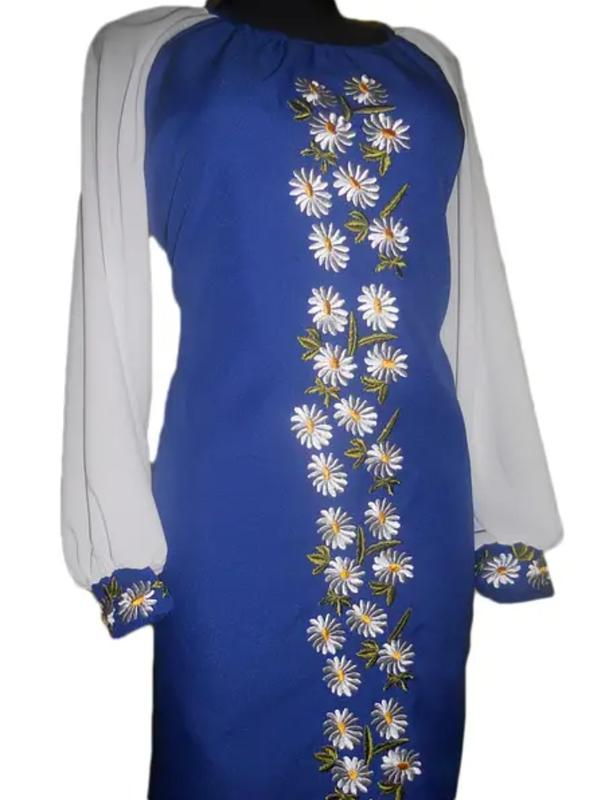 Тканина: на фото - габардин і шифон, (Тканини на вибір - велюр, льон, домоткане полотно, габардин, батист, атлас, онікс, шифон, мадонна); Колір: синій і білий; Фасон плаття: пряме; Довжина плаття: нище коліна; Рукав: довгий; Розмір: 42-60 або Ваші особисті мірки (ріст, обхват грудей, обхват талії, обхват бедер) Під замовлення.